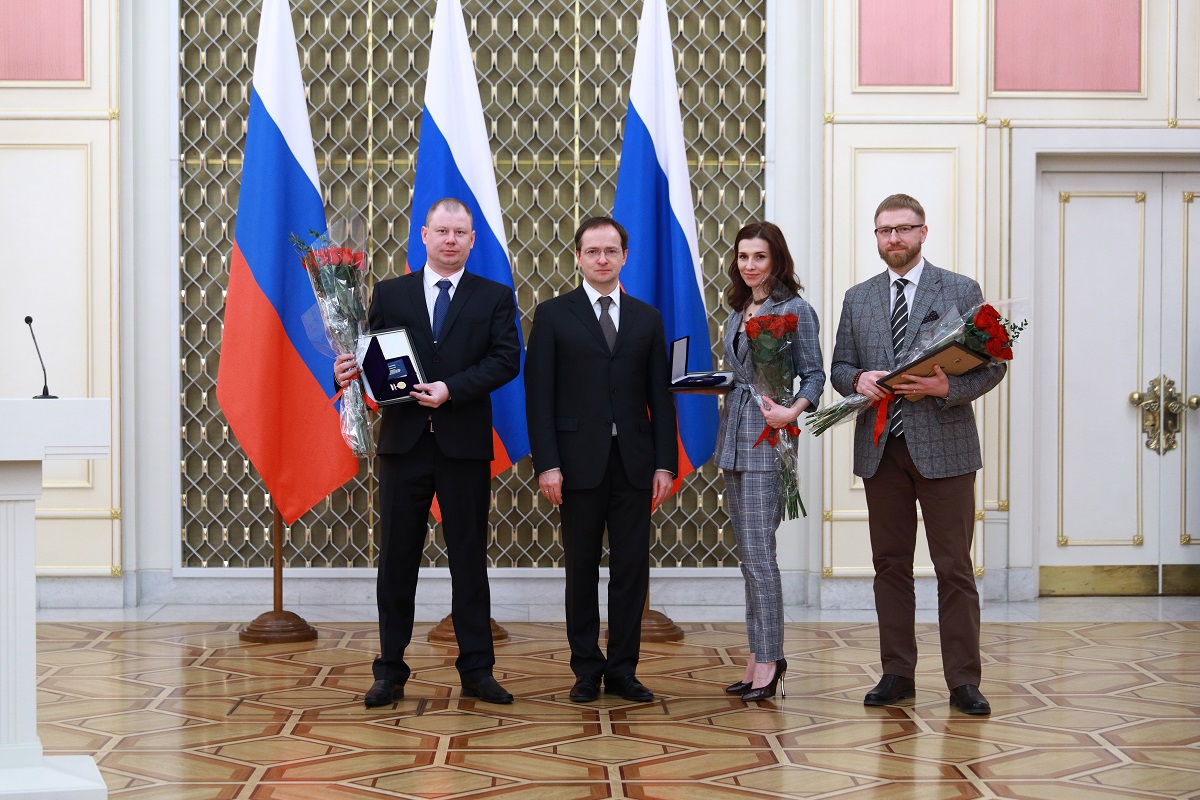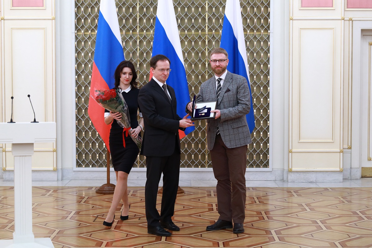 Министр культуры РФ, Председатель РВИО Владимир Мединский вручил премии ведущим мастерам российской литературы, театра, кино, архитектуры.