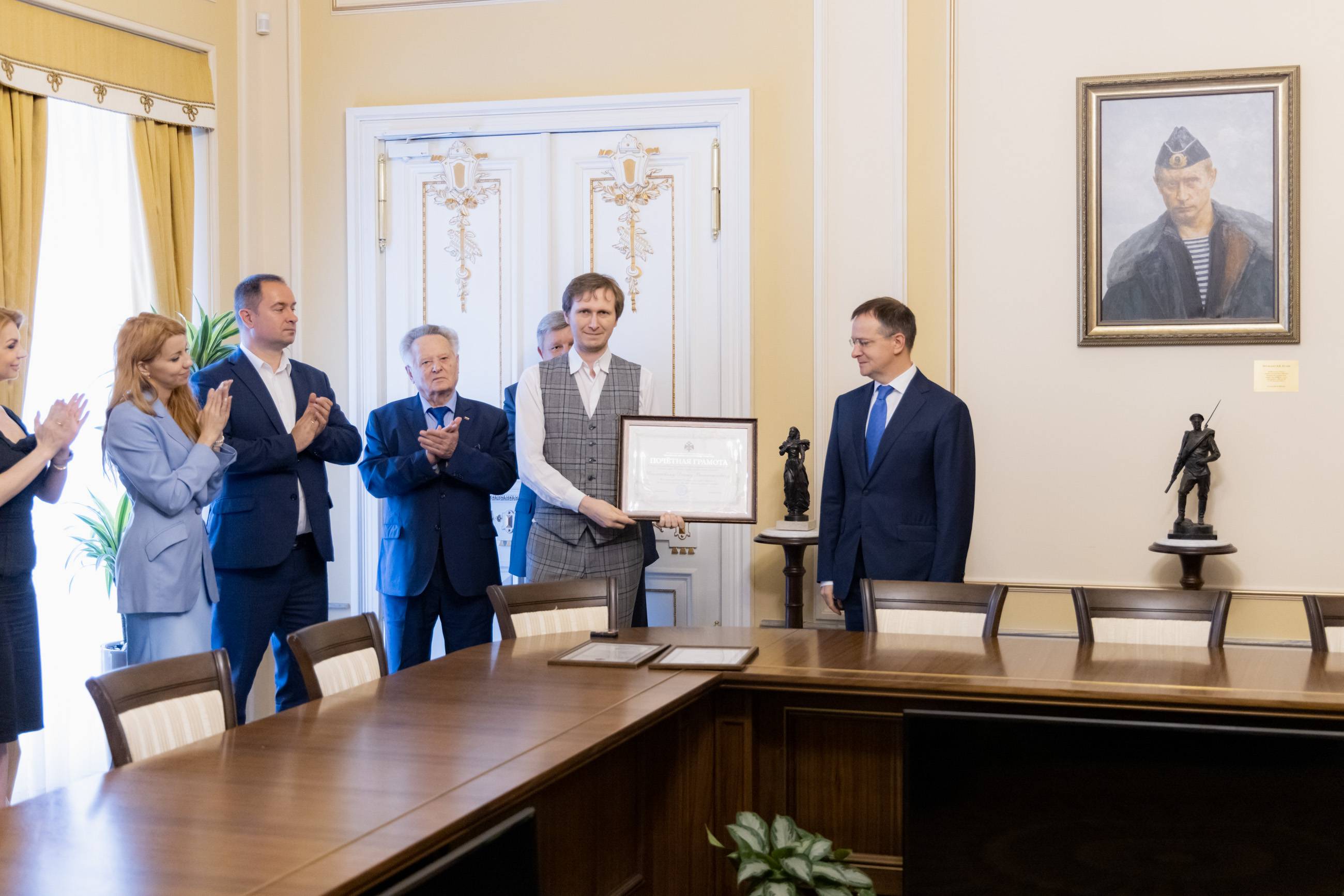 В преддверии Дня России Помощник Президента РФ, Председатель Российского военно-исторического общества Владимир Мединский вручил сотрудникам РВИО Почетные грамоты Российского военно-исторического общества и благодарности.