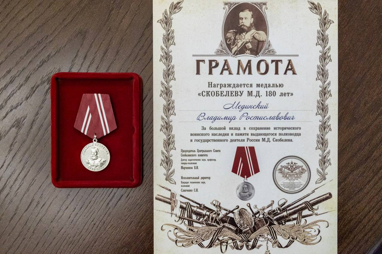 Помощник Президента РФ, Председатель Российского военно-исторического общества Владимир Мединский награжден грамотой и медалью «180 лет Михаилу Дмитриевичу Скобелеву» за вклад в сохранение Исторического воинского наследия и памяти выдающегося полководца и государственного деятеля России Михаила Скобелева.
