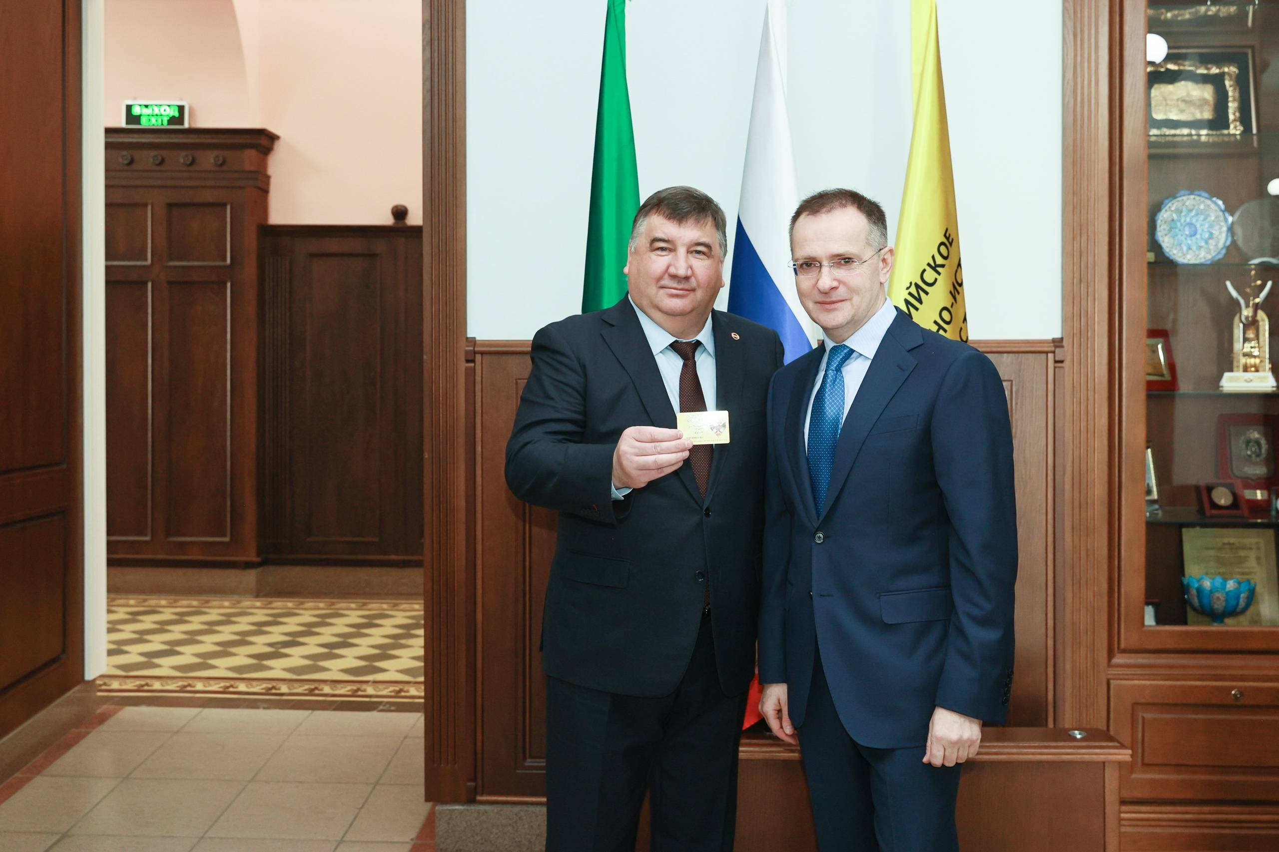 Председатель РВИО вручил ректору КФУ Ленару Сафину членский билет Регионального отделения Российского военно-исторического общества в Республике Татарстан.