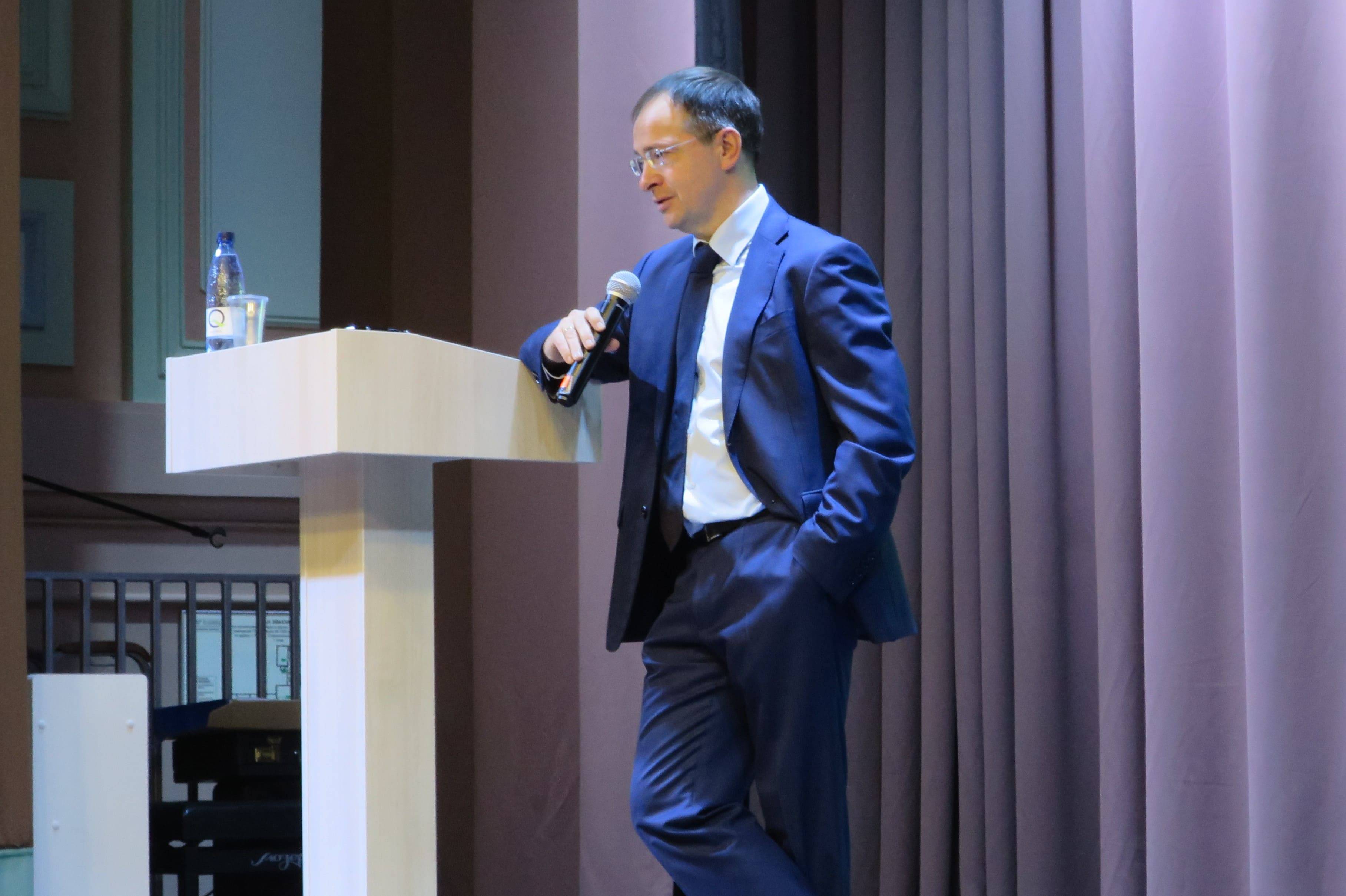 - Сейчас такое время, когда, зачастую, очень многое зависит от первого впечатления, которое вы производите на работодателя, клиента, партнера, заказчика или начальника. И надо уметь это впечатление произвести. Поэтому вы должны уметь делать хорошие презентации, уметь убедительно говорить, показывать глубокие знания. Когда вы рассказываете о каком-то предмете на уроке или экзамене, у учителя должно складываться ощущение, что вы знаете в пять раз больше, чем успеете сказать. Если вы выцеживаете из себя каждое слово, значит, грош вам цена. Навыки презентации – это крайне важно в современном мире, - подчеркнул Владимир Мединский.
