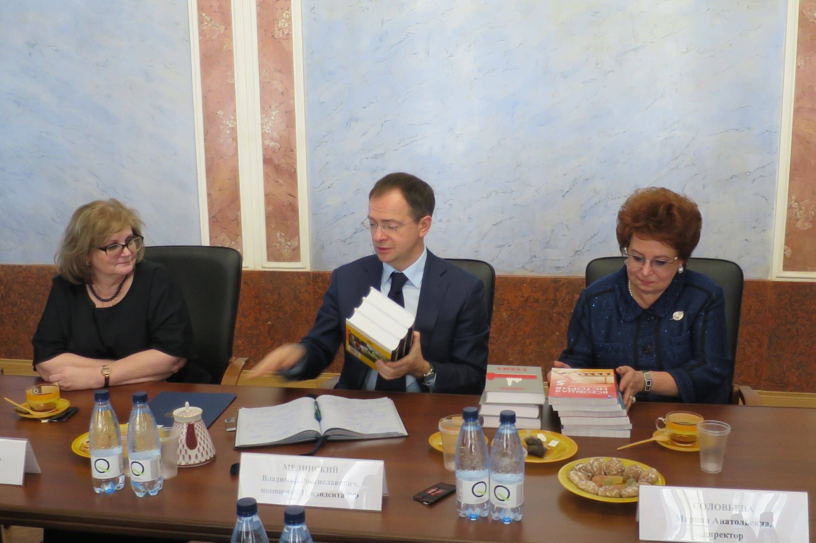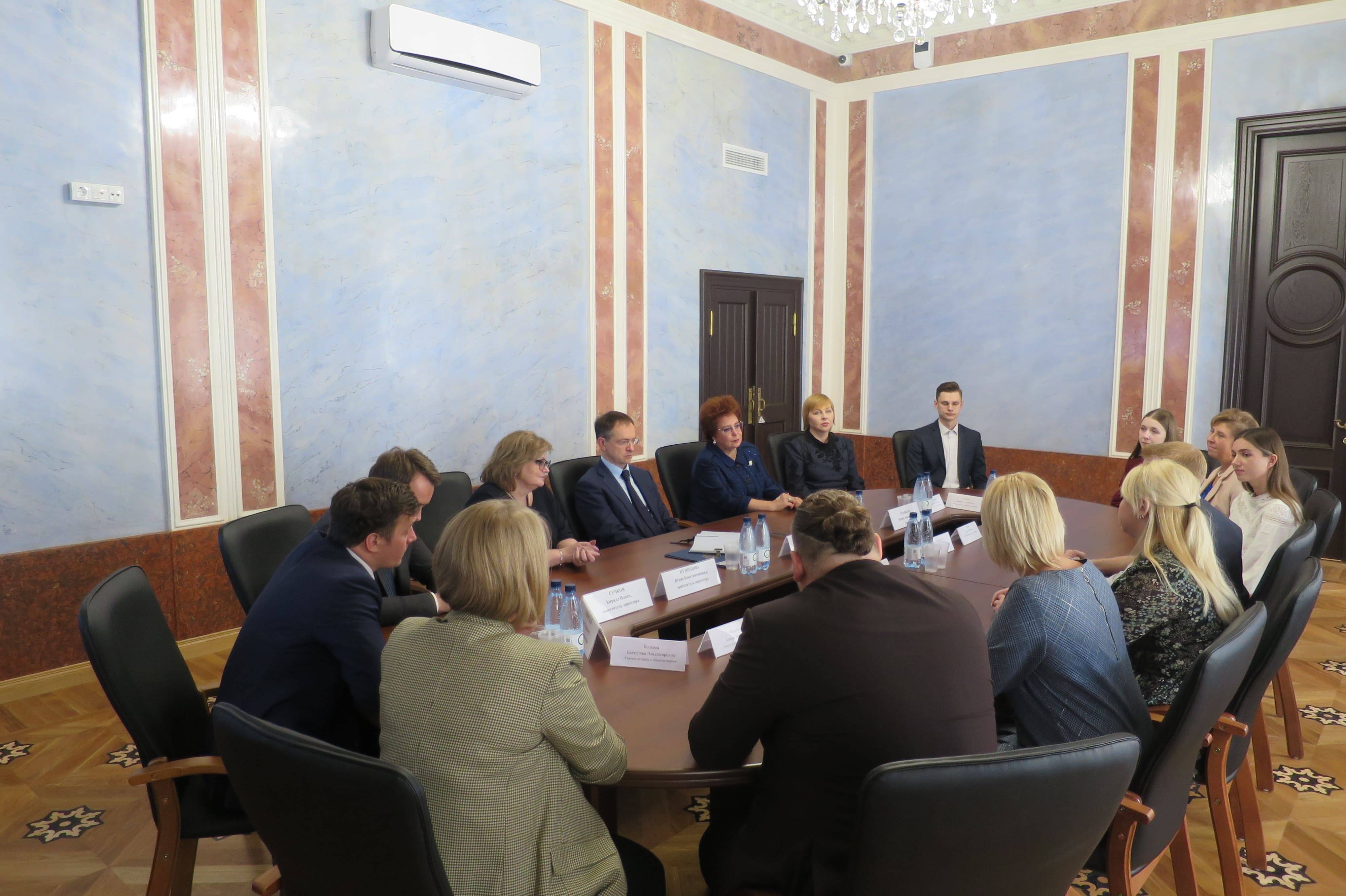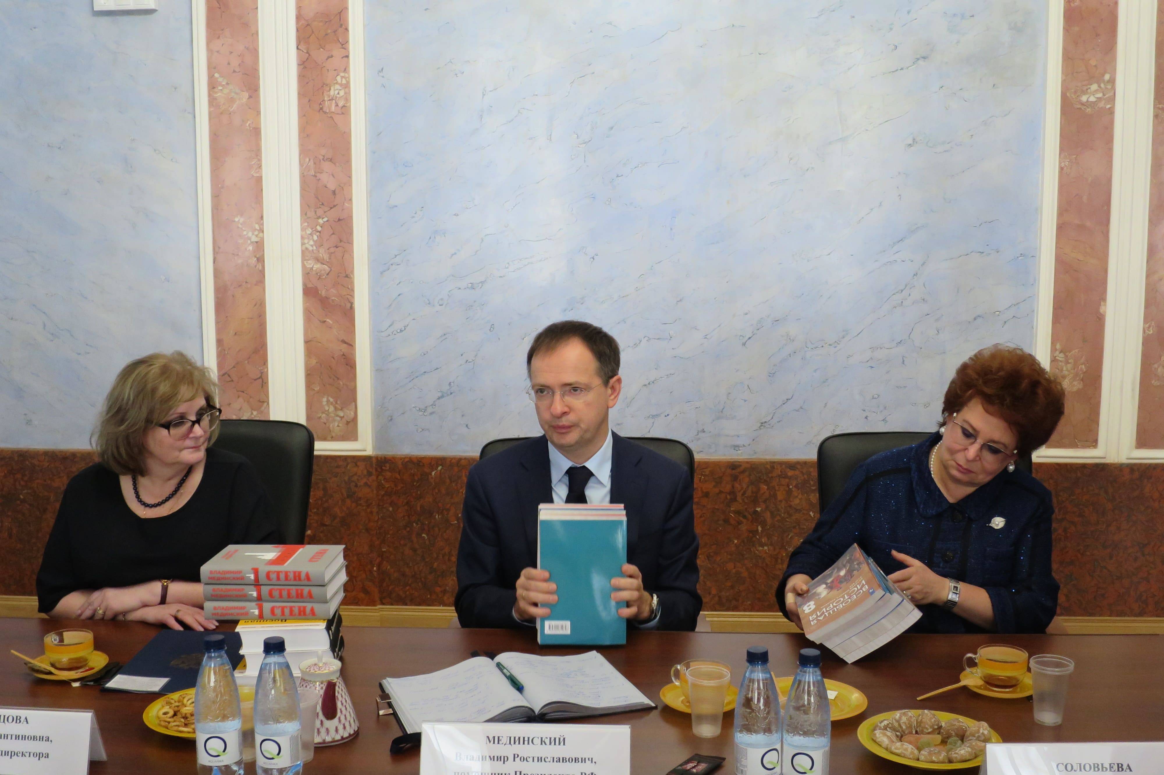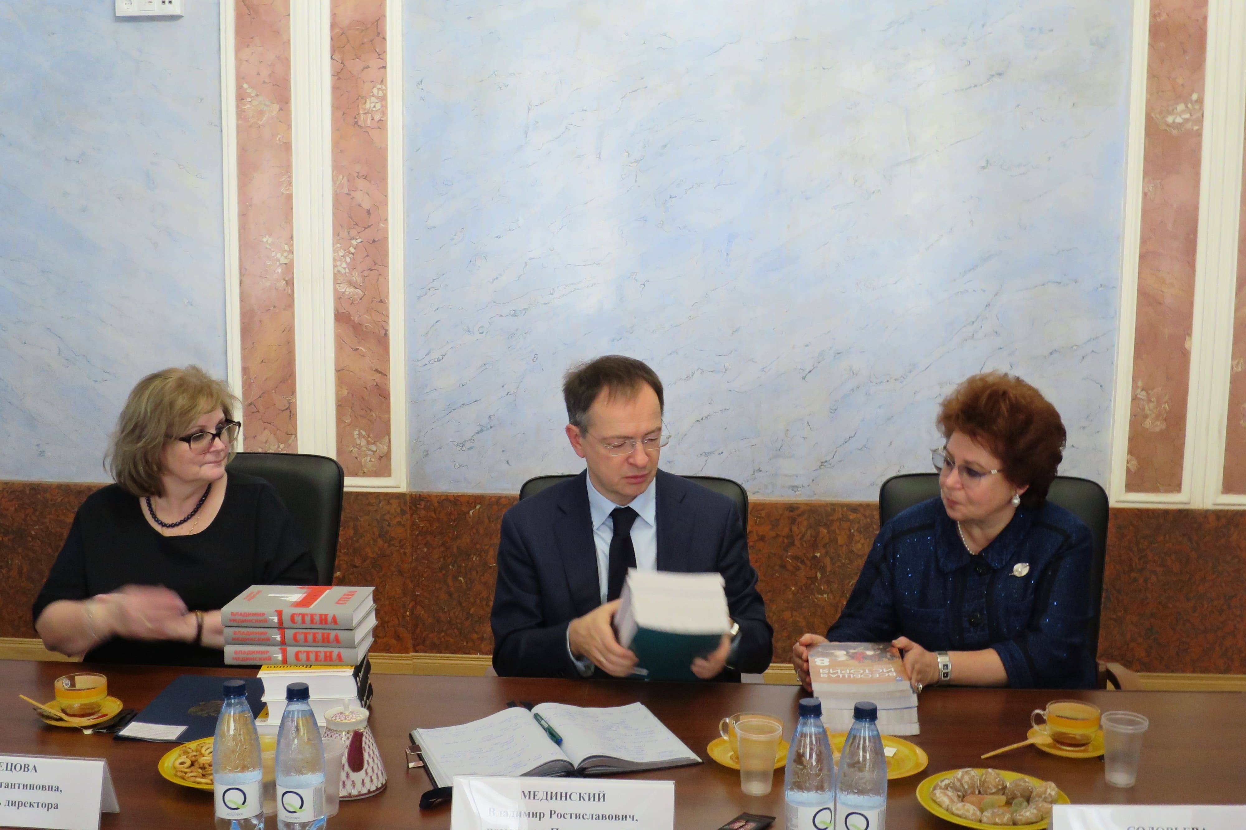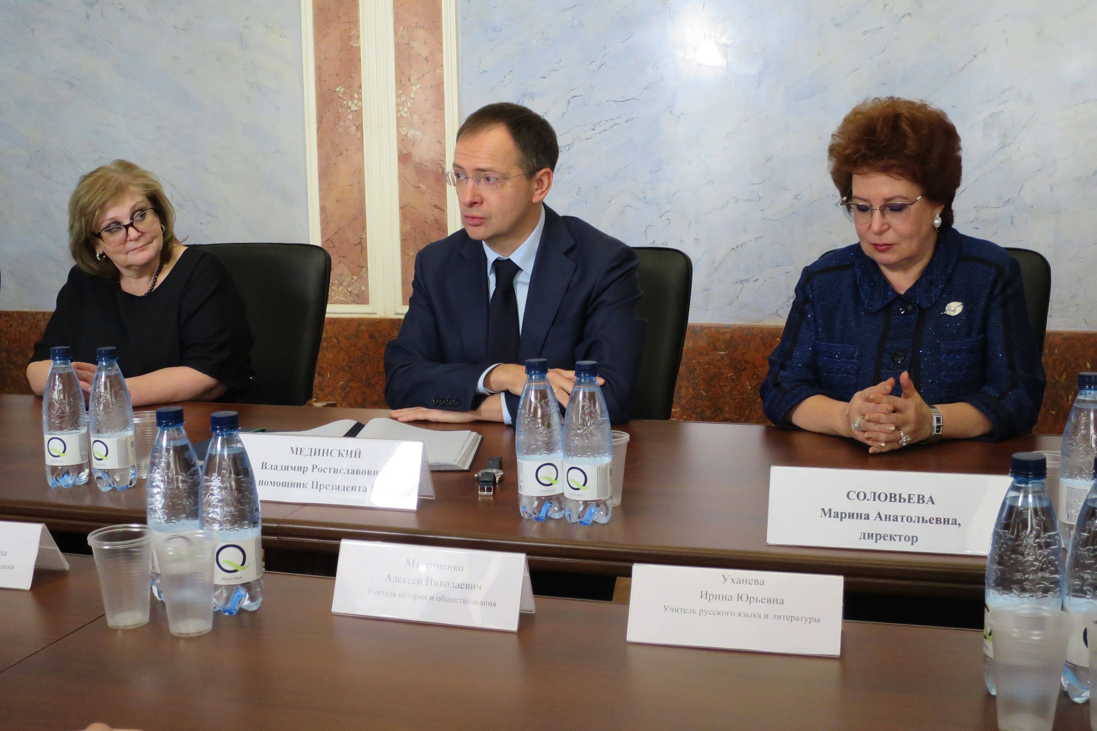 Владимир Мединский обсудил с педагогами подготовку учеников к Единому госэкзамену, необходимость снижения бюрократической отчетности, развитие сотрудничества школ и высших учебных заведений, целесообразность введения единой школьной формы и другие вопросы. Он также передал школе комплекты УМК по истории России и всемирной истории, учебные пособия «Военная история России» и издания исторического романа «Стена».