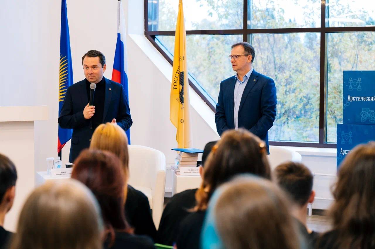 Помощник Президента РФ, Председатель Российского военно-исторического общества Владимир Мединский и Губернатор Мурманской области Андрей Чибис провели «Арктический диалог» с молодёжью Мурманской области.