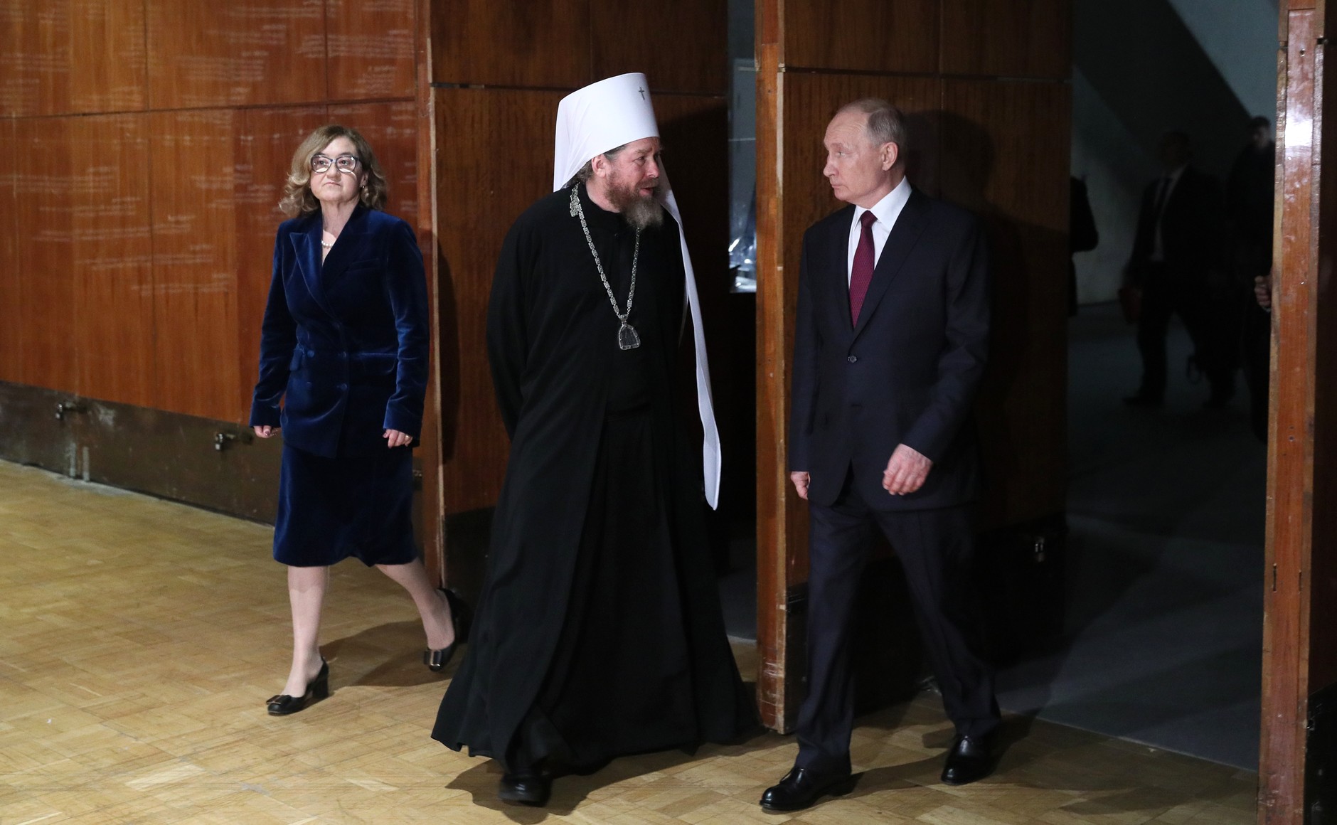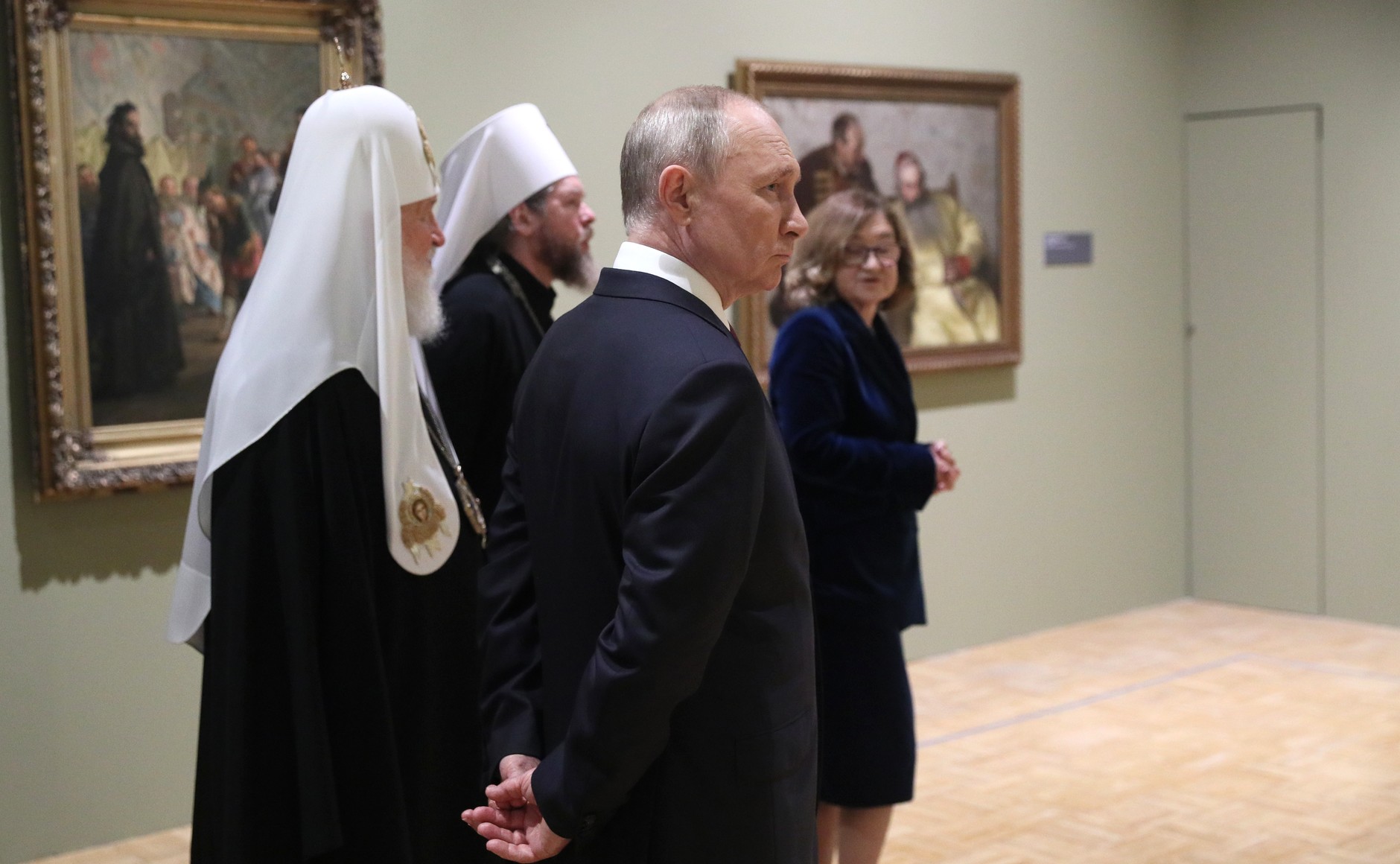 Об экспозиции главе государства и Предстоятелю Русской Православной Церкви рассказали председатель Патриаршего совета по культуре, митрополит Псковский и Порховский Тихон и генеральный директор Третьяковской галереи Зельфира Трегулова.