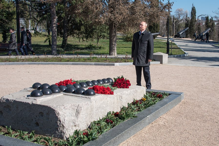 Сегодня Президент Российской Федерации Владимир Путин посетил мемориальный комплекс «Малахов курган», где осмотрел музейную экспозицию, посвящённую подвигу российских солдат в Крымской войне 1853-1856 годов, а также возложил цветы к памятнику вице-адмиралу Владимиру Корнилову.