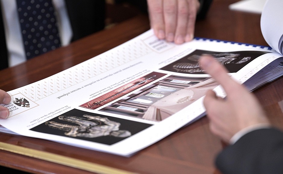 Сегодня в Кремле состоялась встреча Президента Российской Федерации Владимира Путина с Министром культуры Российской Федерации, Председателем Российского военно-исторического общества Владимиром Мединским. Речь шла о ходе выполнения поручений Главы государства, в частности о создании музейных центров, музеефикации усадеб и фортов.