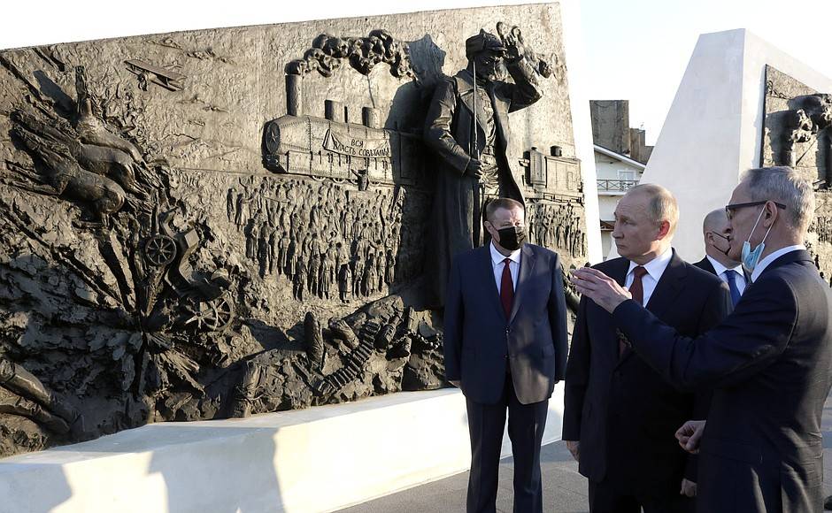 Президента с мемориалом знакомил Научный директор РВИО Михаил Мягков. Он рассказал историю его создания и показал элементы, барельефы, цитаты из стихотворений.