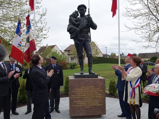 Памятник воинам экспедиционного корпуса Русской армии выполнен российским скульптором Александром Таратыновым. Монументальная композиция представляет собой бронзовую фигуру русского солдата, держащего на руках французскую девочку.