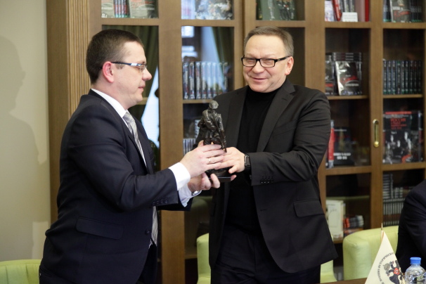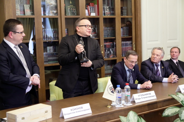 В свою очередь Советник Председателя РВИО Ростислав Мединский поблагодарил режиссера за вклад в сохранение исторического наследия и патриотическое воспитание молодежи. На память он преподнес кинорежиссеру уменьшенный бюст русского полководца и святого Александра Невского.
