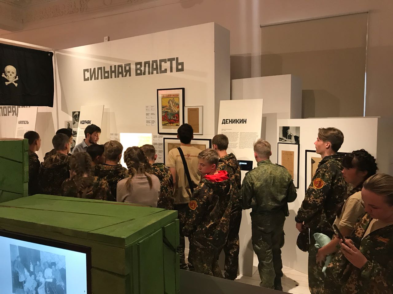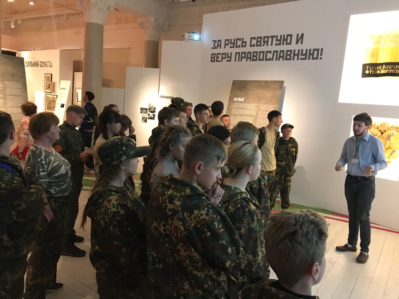 Экскурсия по выставке прошла в рамках образовательной программы, разработанной Российским военно-историческим обществом. Участники смены узнали о событиях, которые разворачивались в стране с 1917 по 1922 год, и о трех основных движениях Гражданской войны — красных, белых и «Зеленом движении» крестьян-повстанцев. Особым вниманием у ребят пользовались оружие, плакаты, фотографии и кадры кинохроники того времени, представляющие трагедию населения, попавшего в эпицентр вооруженной борьбы разных политических сил.