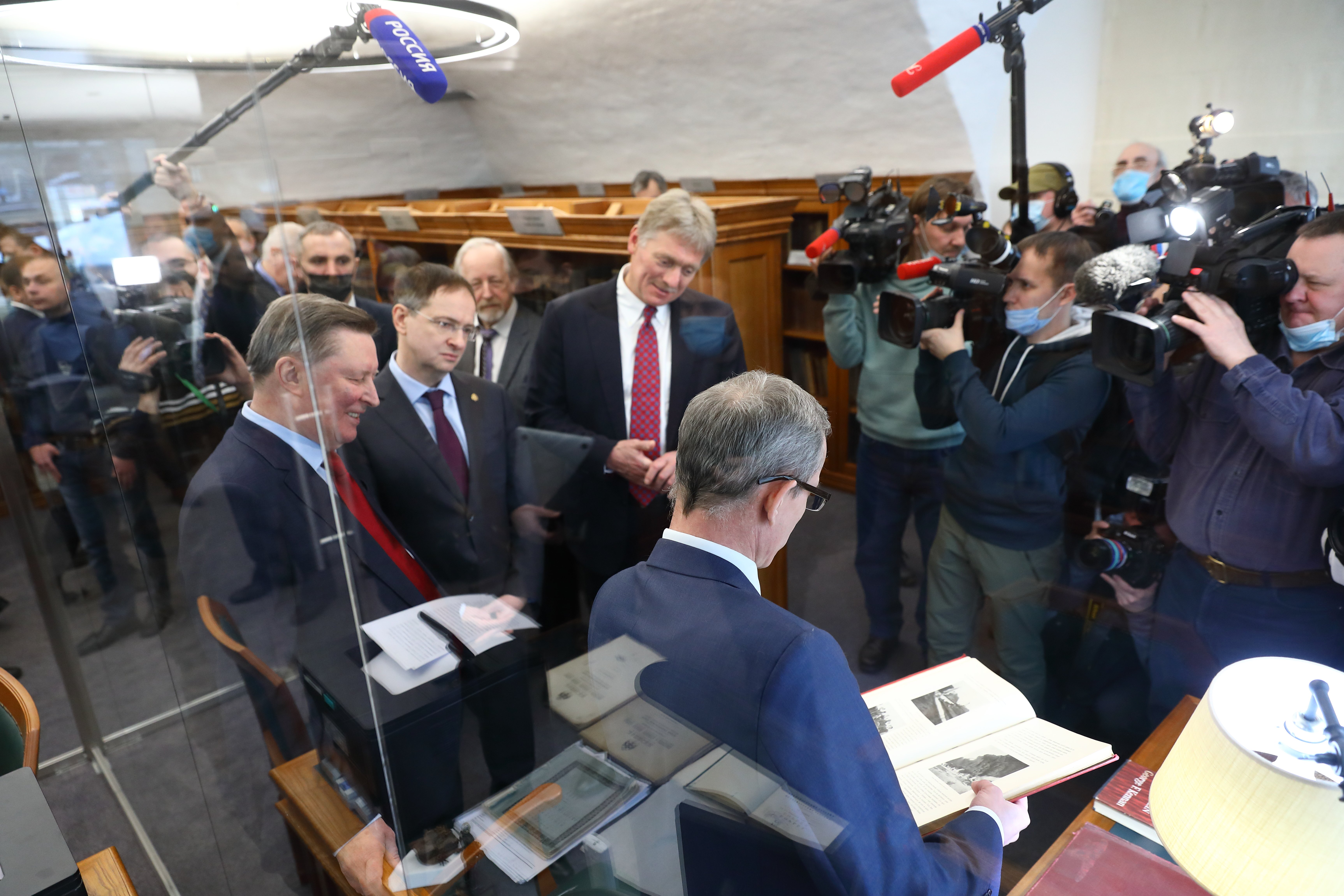 После презентации телеграммы научный директор РВИО Михаил Мягков провел для гостей экскурсию по новым помещениям библиотеки и рассказал о ее книжных фондах.