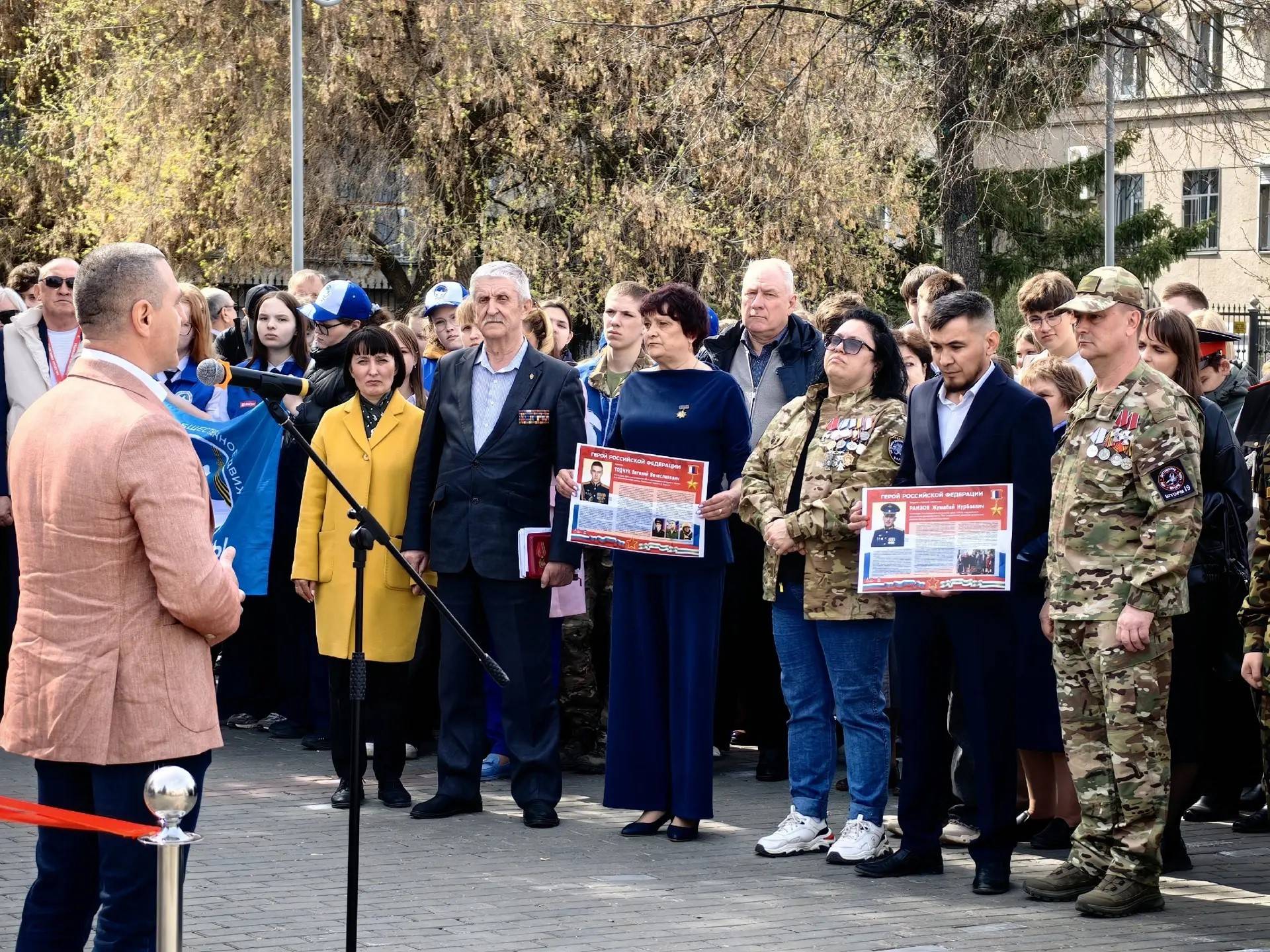 На церемонию приехали ветераны СВО, родители и родные Героев, кадеты, школьники, студенты, представители власти. Торжественную атмосферу открытию придало внесение Государственного флага Российской Федерации – его выполнила знамённая группа поста № 1 школы № 75 имени Героя России Е. В. Родькина.