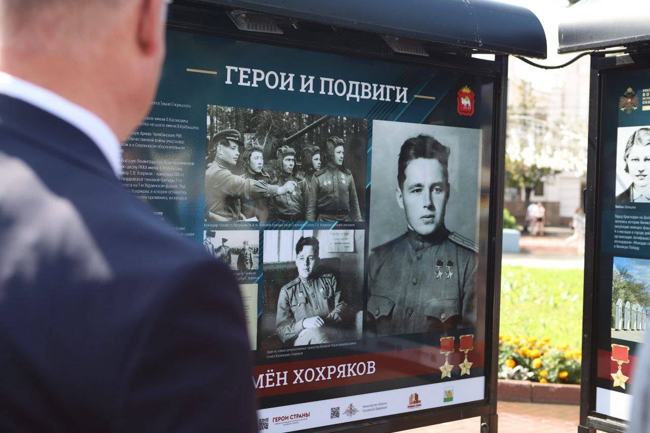 На стендах, посвященных Героям Великой Отечественной войны, представлены фотографии дважды Героев Советского Союза Семёна Хохрякова, Кирилла Евстигнеева, Сергея Грицевца. Их фото были предоставлены Государственным комитетом по делам архивов Челябинской области.