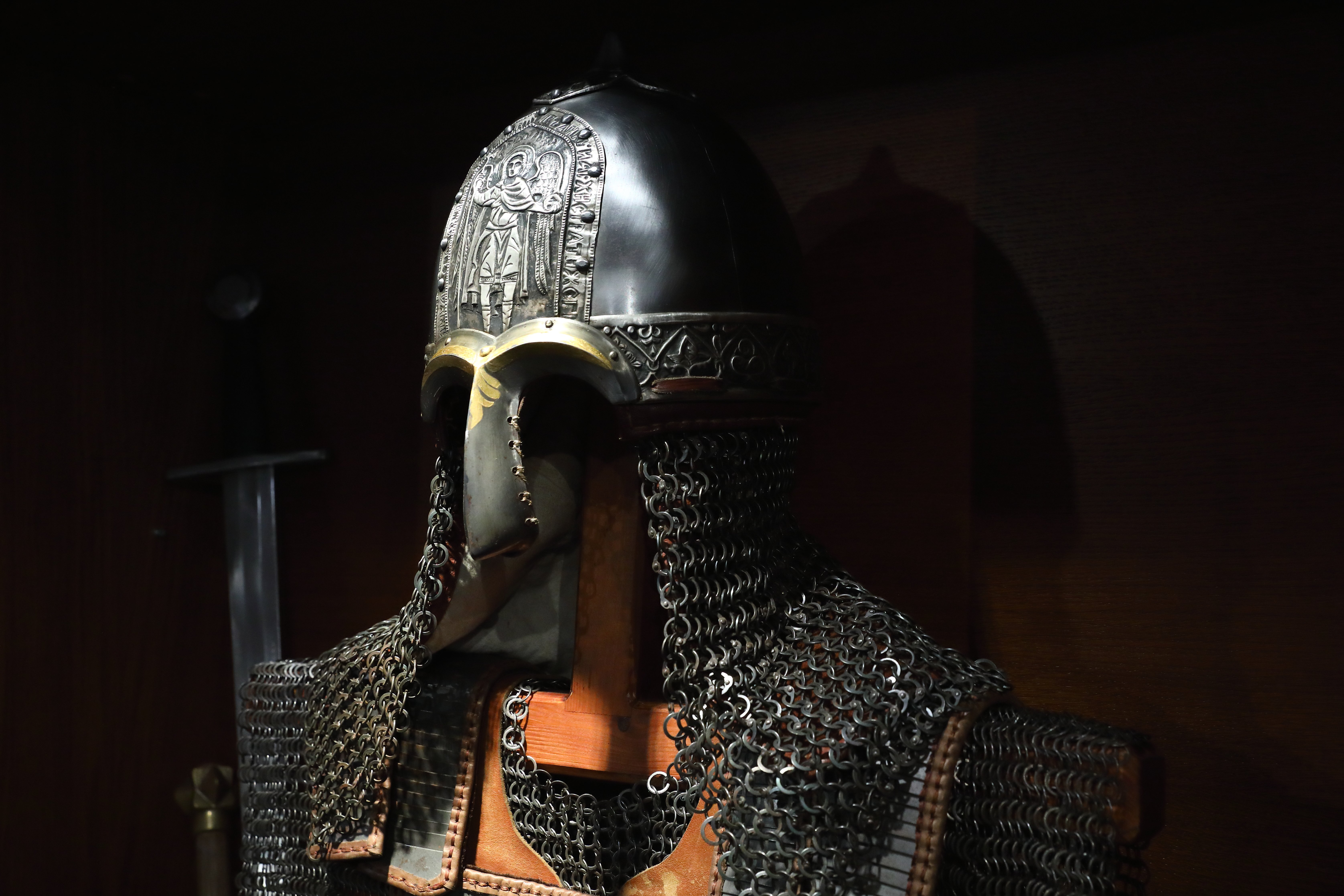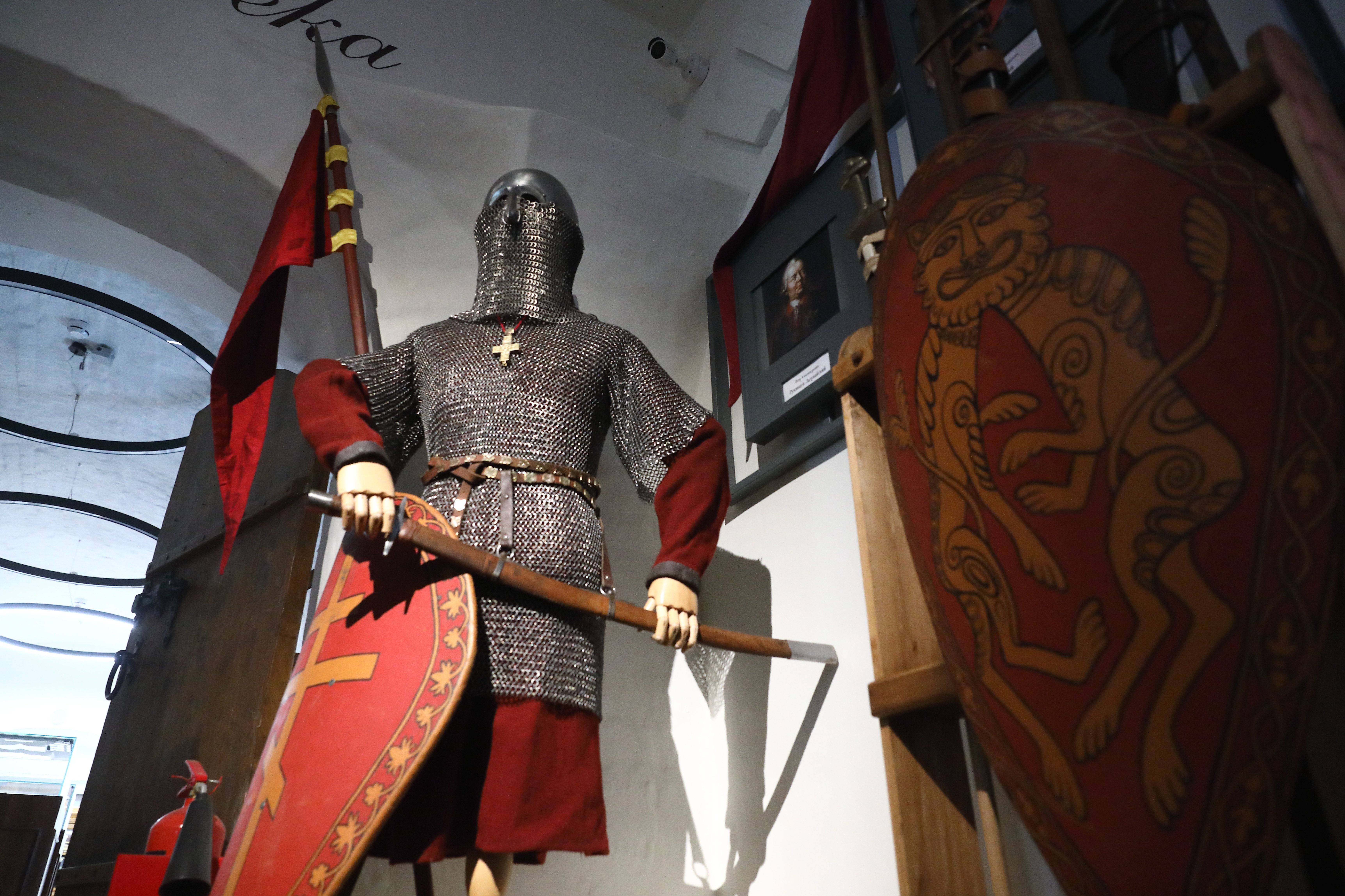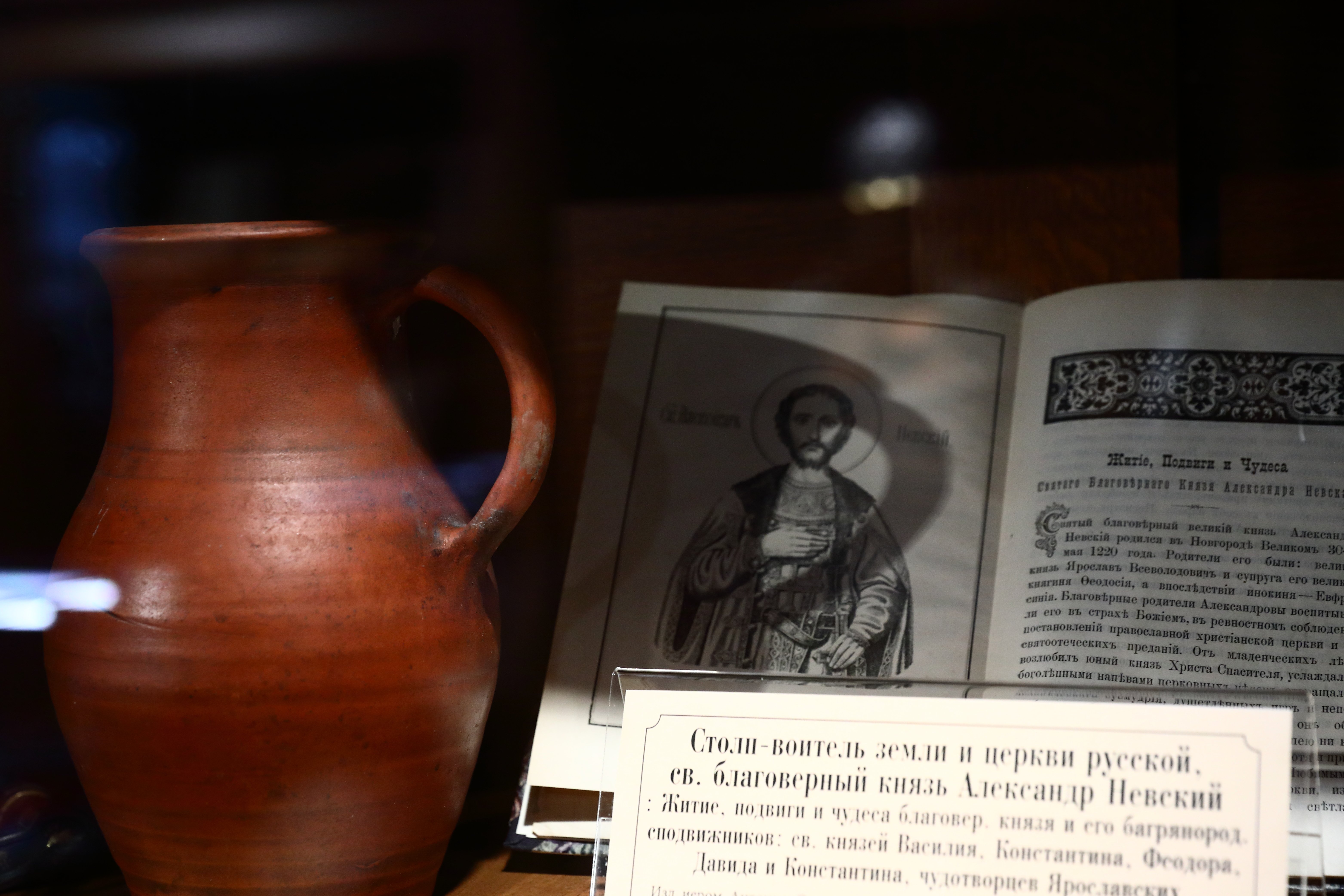 Погружение в эпоху обеспечили полноразмерные модели средневековых воинов, одетые в реплики доспехов XIII века, подлинные образцы оружия и предметы воинской экипировки времен Александра Невского. Центральное место в этом ряду экспонатов заняла точная копия оригинального шлема отца Александра Невского - великого князя Ярослава Всеволодовича. Долгие годы шлем воспринимался как часть экипировки самого Александра, что нашло отражение в фильме Сергея Эйзенштейна.
