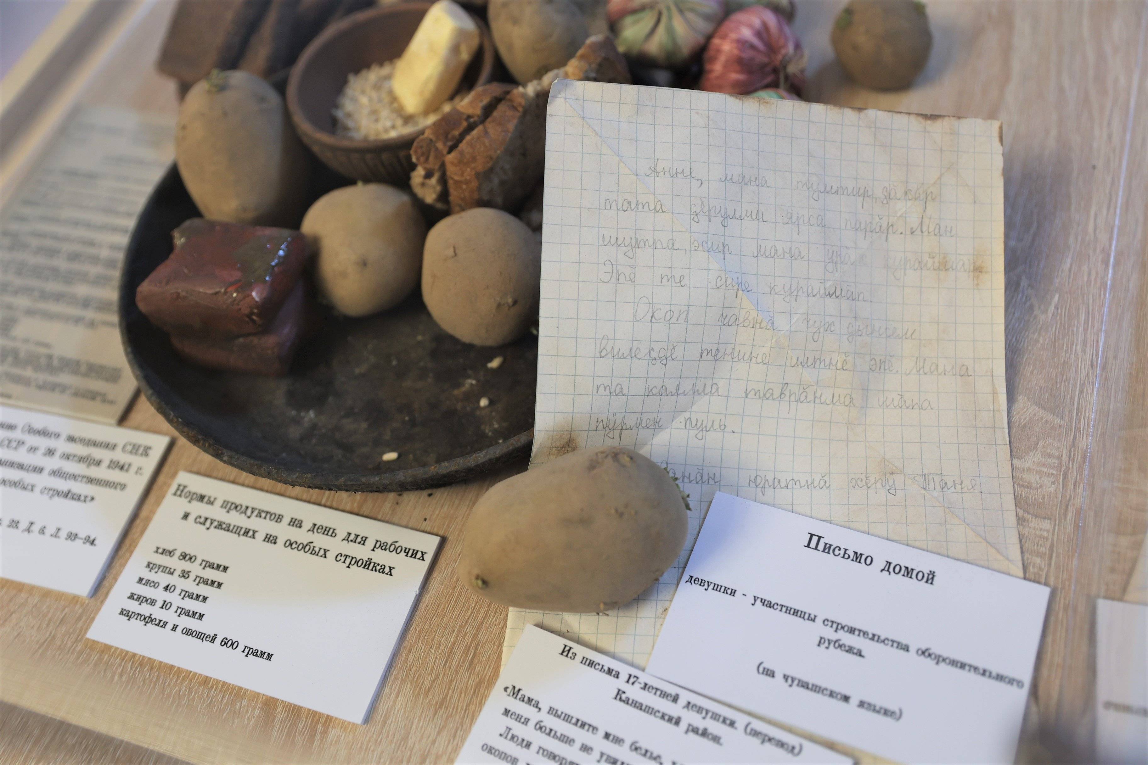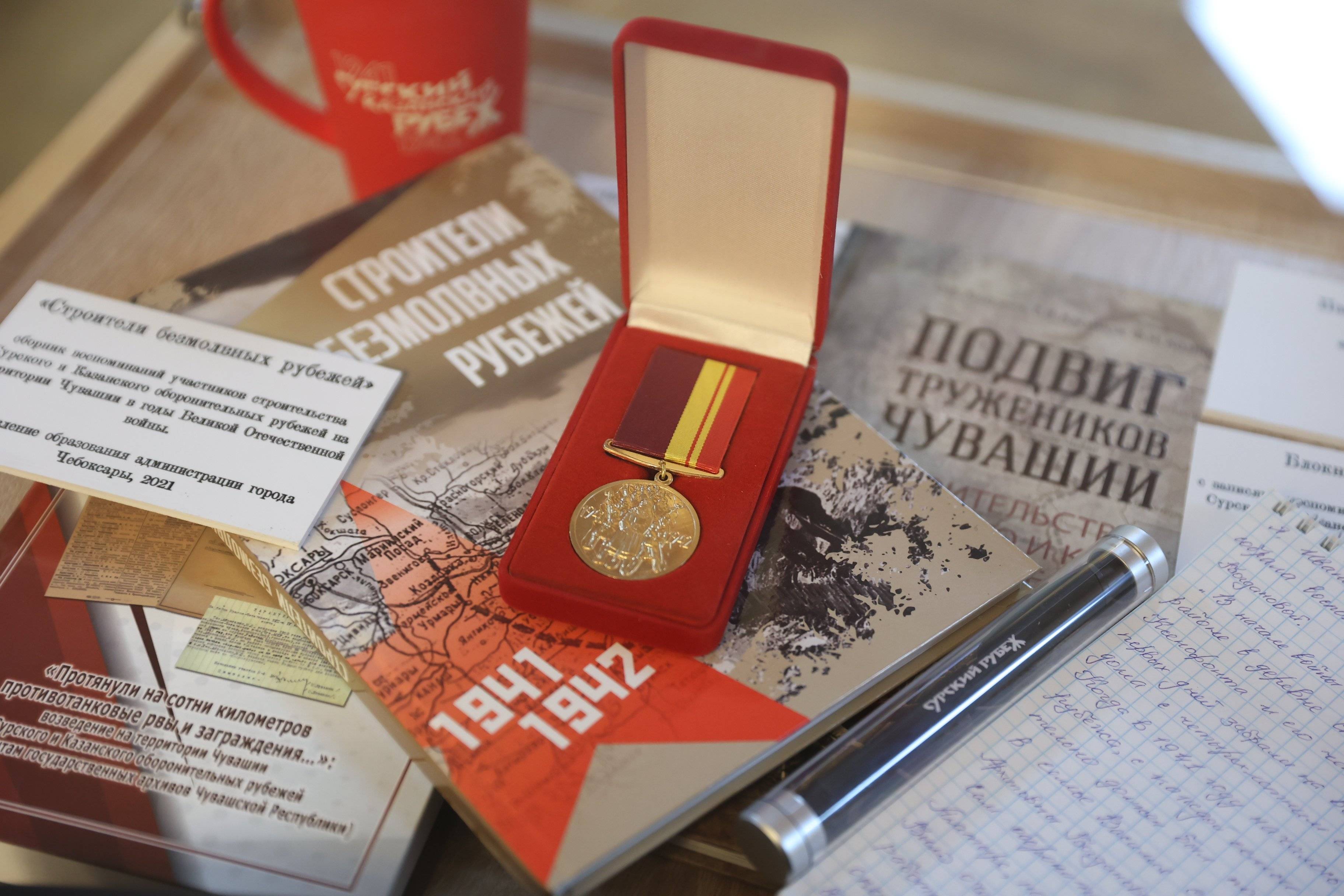 В числе экспонатов также памятная медаль, посвящённая 80-летию строительства Сурского и Казанского оборонительных рубежей – учрежденная Указом Главы Чувашской Республики, макеты мемориала «Строителям безмолвных рубежей» и первого здания завода № 320 (Чебоксарское производственное объединение имени В. И. Чапаева).