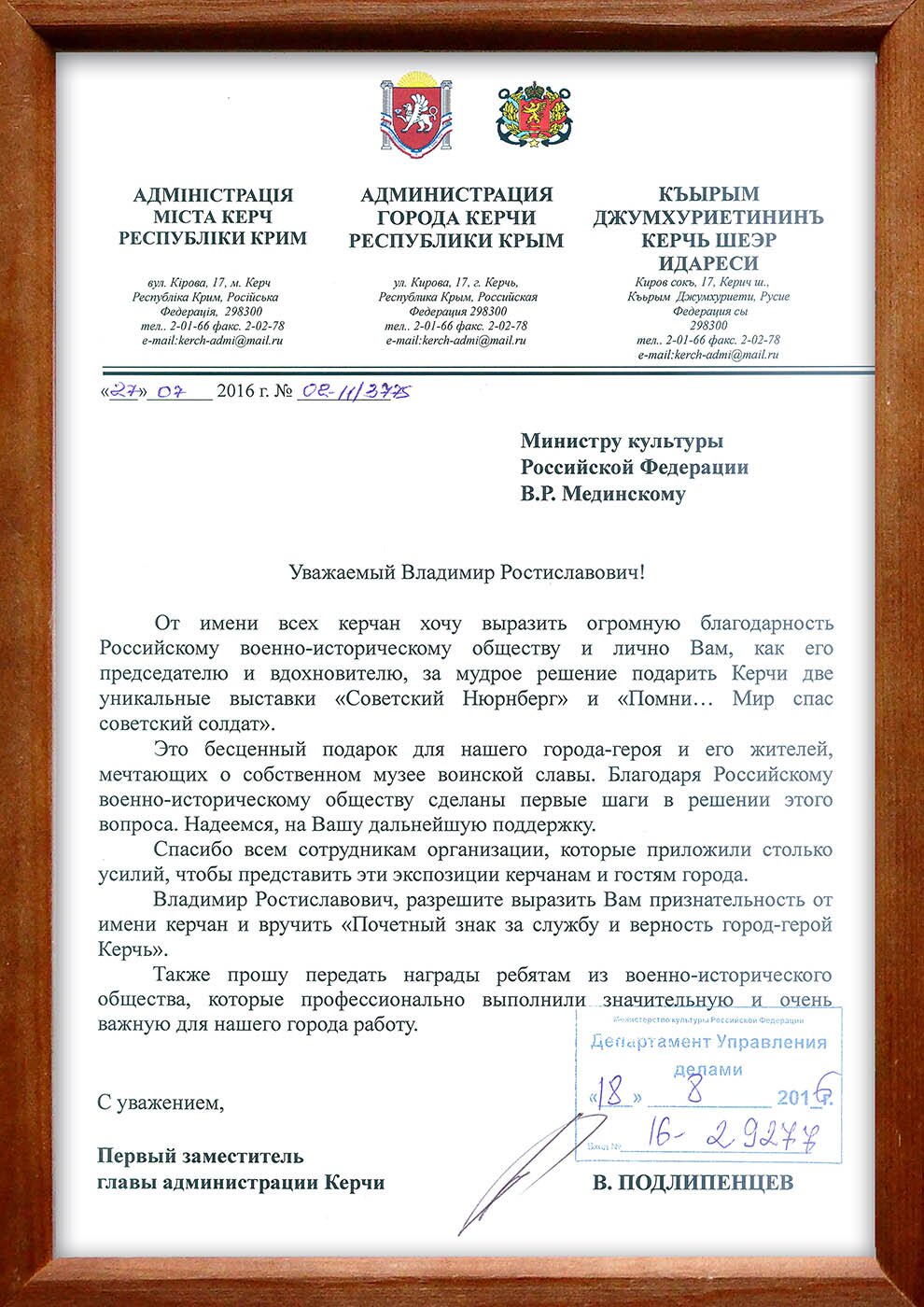 Глава администрации Керчи Владимир Подлипенцев прислал благодарственное письмо на имя Владимира Мединского.