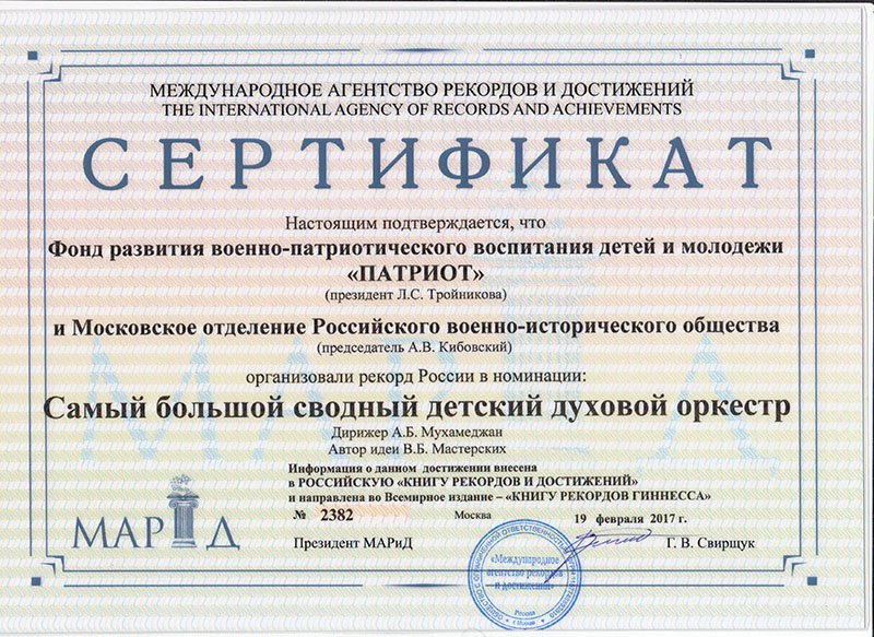 Выступление сводного детско-молодежного военно-исторического духового оркестра, состоявшееся в преддверии Дня защитника в Центральном музее Великой Отечественной войны, официально признано самым большим сводным детским духовым оркестром по версии Российской «Книги рекордов и достижений».