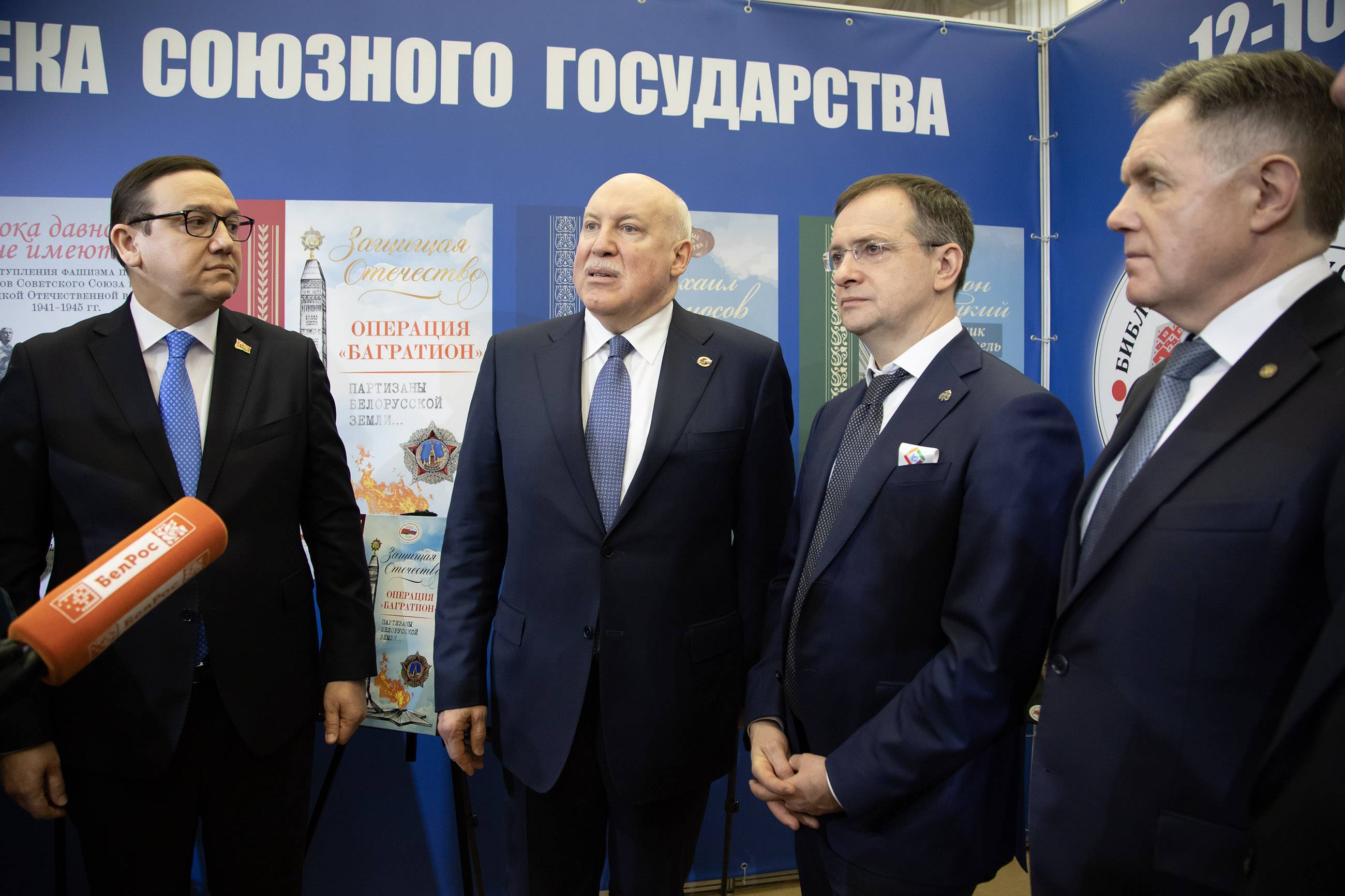В церемонии открытия выставки приняли участие помощник Президента РФ, Председатель Российского военно-исторического общества, Председатель Союза писателей России Владимир Мединский и Председатель Союза писателей Беларуси Александр Карлюкевич.