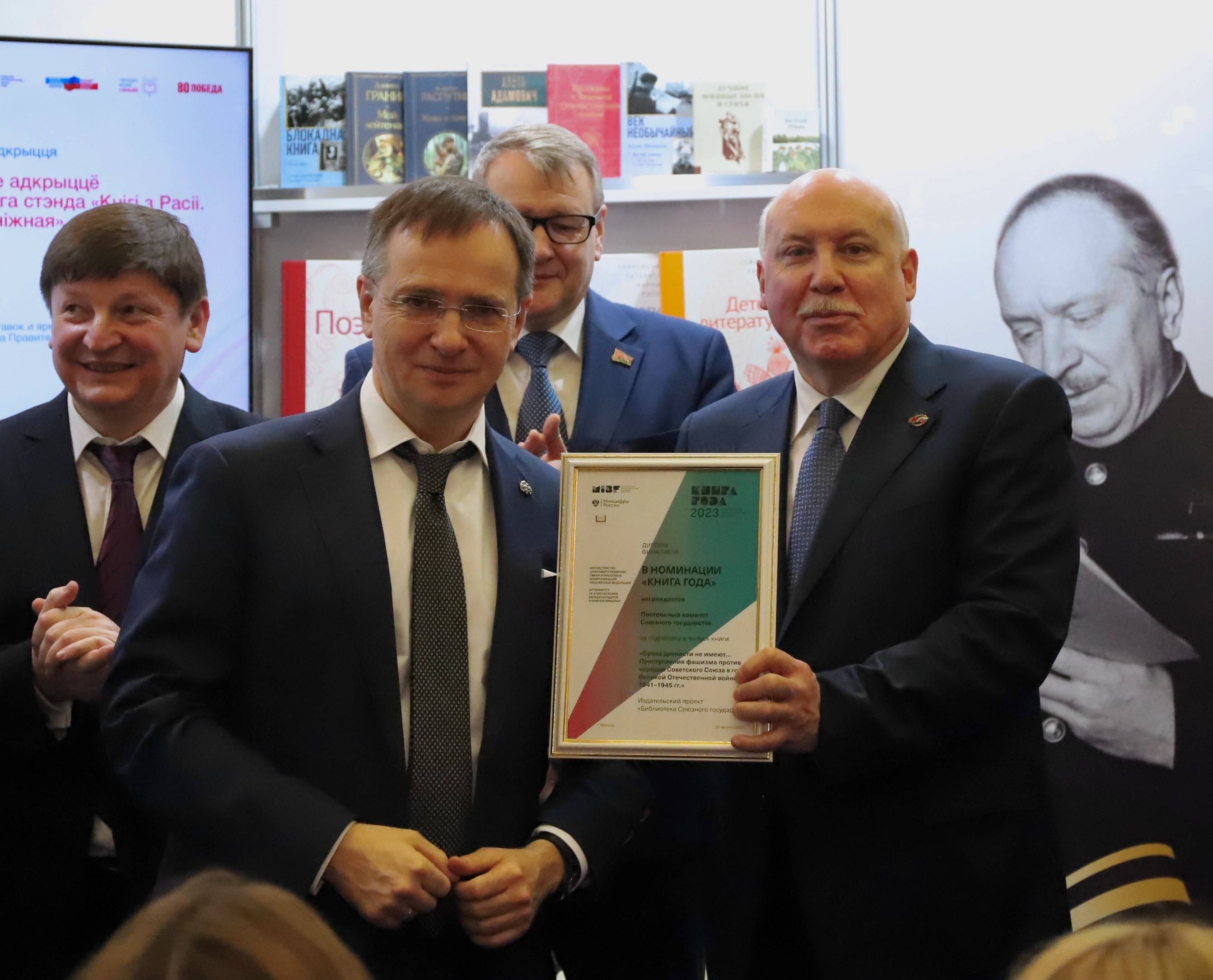 В первый день работы выставки был открыт объединенный стенд «Книги из России. Москва книжная». На церемонии открытия стенда Владимир Мединский вручил Государственному секретарю Союзного государства Дмитрию Мезенцеву специальные дипломы жюри конкурса «Книга года» за подготовку и выпуск уникальных исторических документальных исследований «Срока давности не имеют… преступления фашизма против народов Советского Союза в годы Великой Отечественной войны 1941–1945 гг.» и «Операция «Багратион». Партизаны белорусской земли…».
