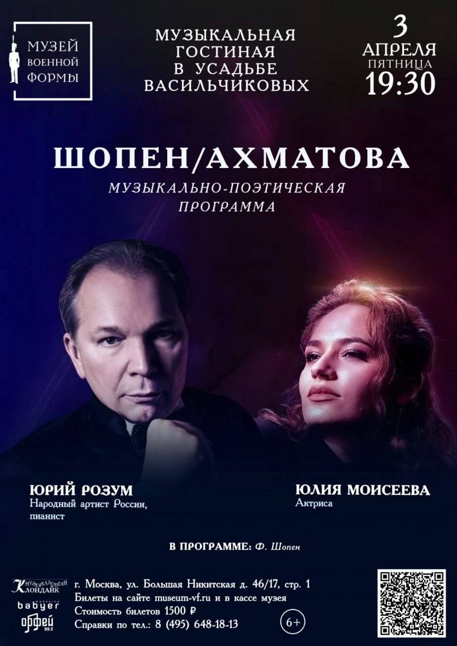 3 апреля в 19.30 в Музее военной формы РВИО (Москва, ул. Большая Никитская, д. 46/17, стр. 1.) Народный артист России Юрий Розум и актриса Юлия Моисеева представят музыкально-поэтический вечер «Шопен/Ахматова».