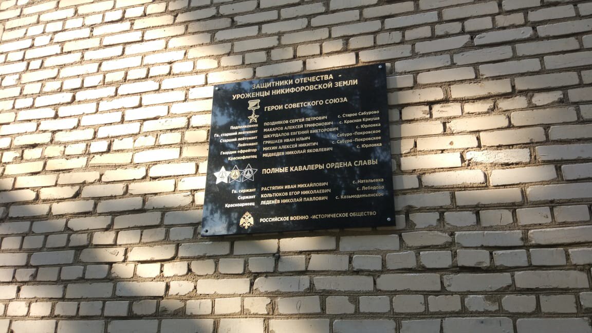 Помимо памятника в посёлке Дмитриевка была торжественно открыта и мемориальная доска Героям Советского Союза и полным Кавалерам Ордена Славы, которые являются уроженцами Никифоровской земли.