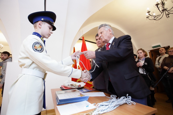 После поздравлений от почетных гостей юные кадеты отправились на познавательную экскурсию по выставке «Герои Отечества. Георгиевская история России», которая проходит в здании «Стрелецких палат». А в завершение церемонии ребятам вручили подарки: памятные знаки РВИО, аксельбанты к парадной форме и фотоальбомы с текстом торжественной клятвы. Ждал ребят и еще один сюрприз: в новом году для всех суворовцев, кадетов и нахимовцев будет бесплатный проезд на общественном транспорте. Соответствующий законопроект принят Государственной Думой по предложению Героев Советского Союза и Героев Российской Федерации.